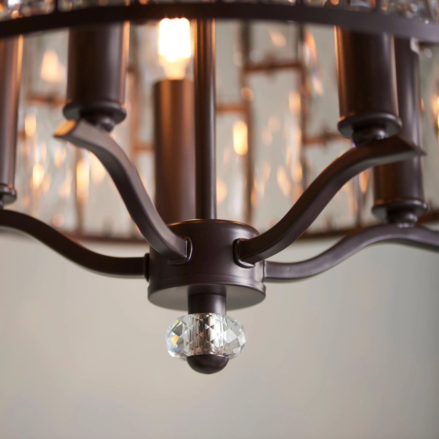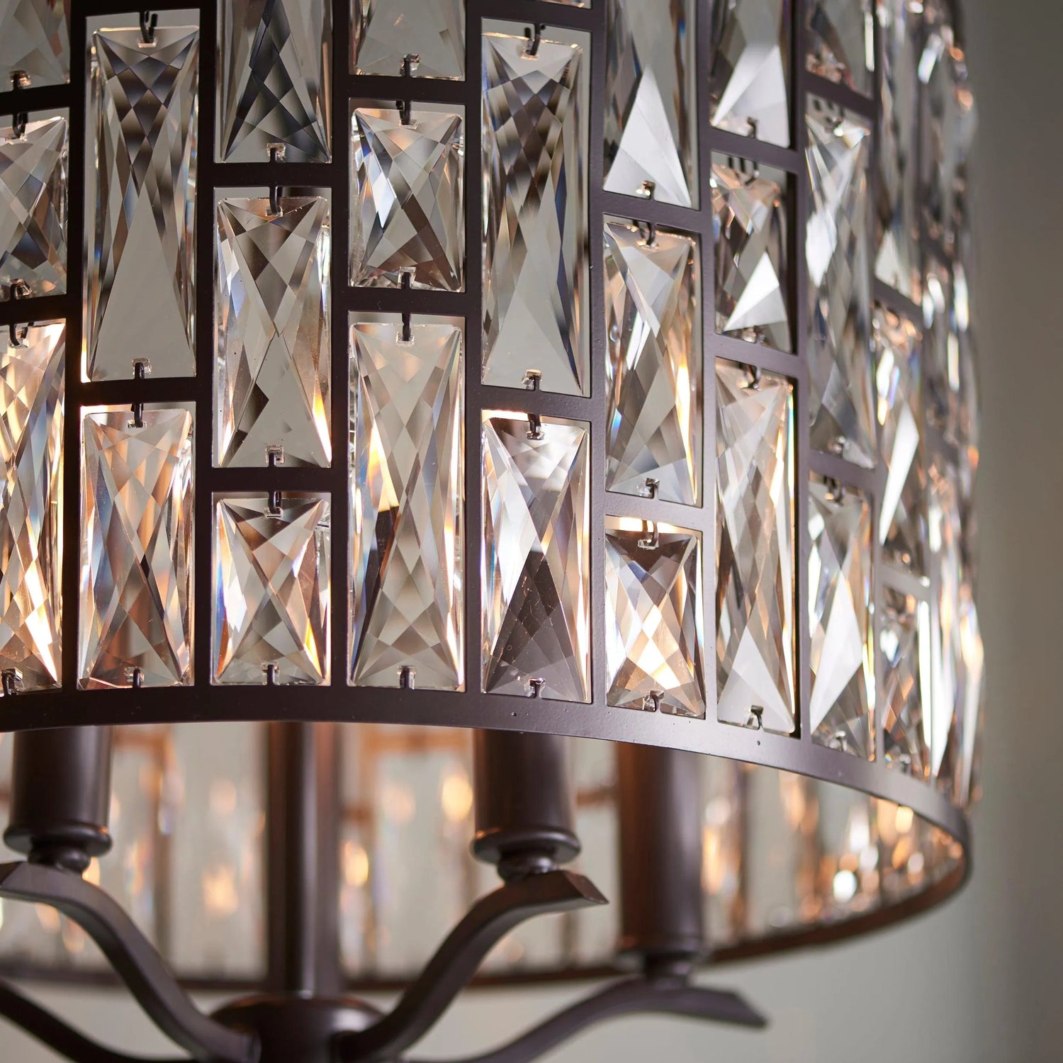 The Belle 5 light pendant mixes high quality faceted clear glass crystals, arranged in a striking tiered pattern, with an understated dark bronze effect finish. Once lit each crystal combines to create an intensified decorative light effect. Perfect for timeless classic interiors.