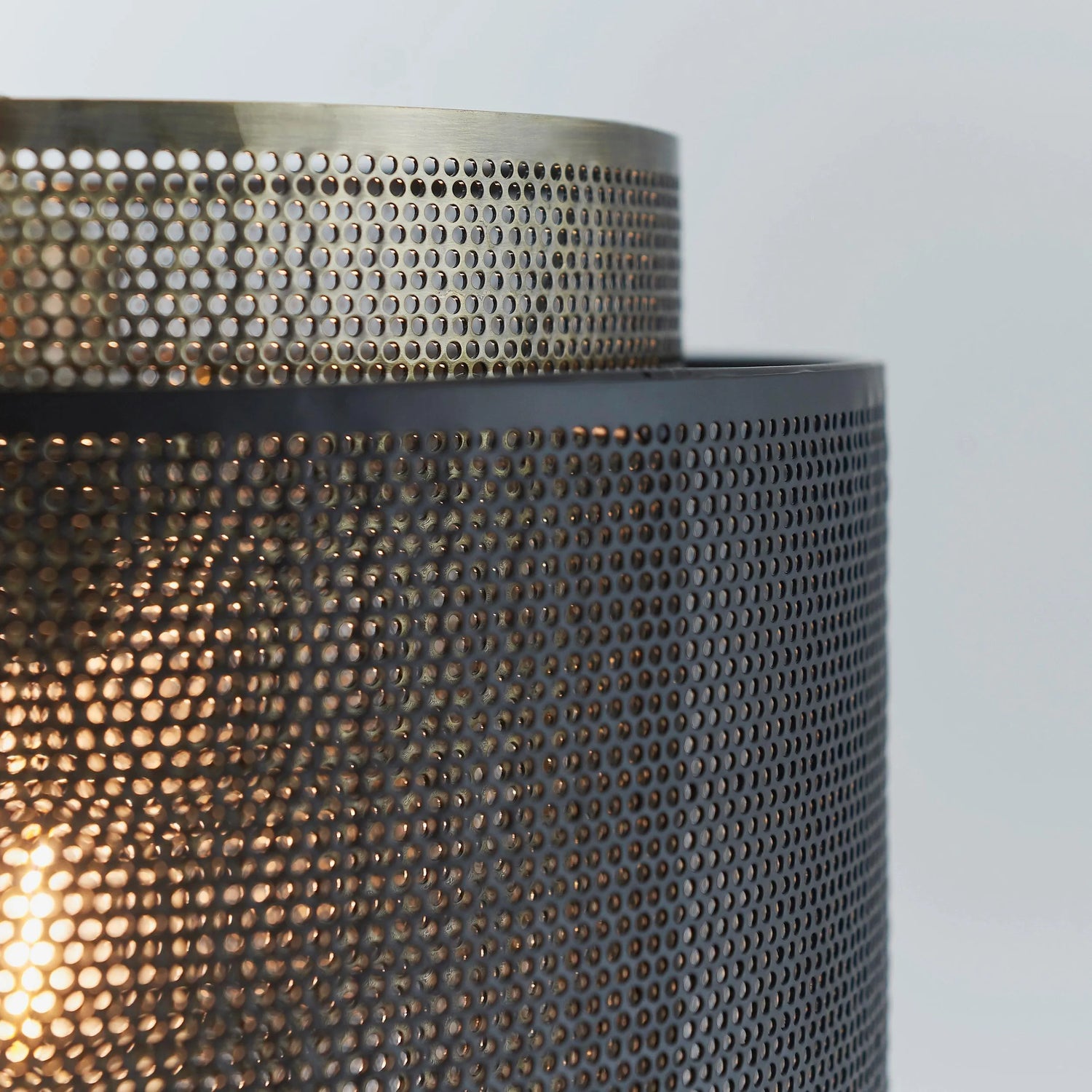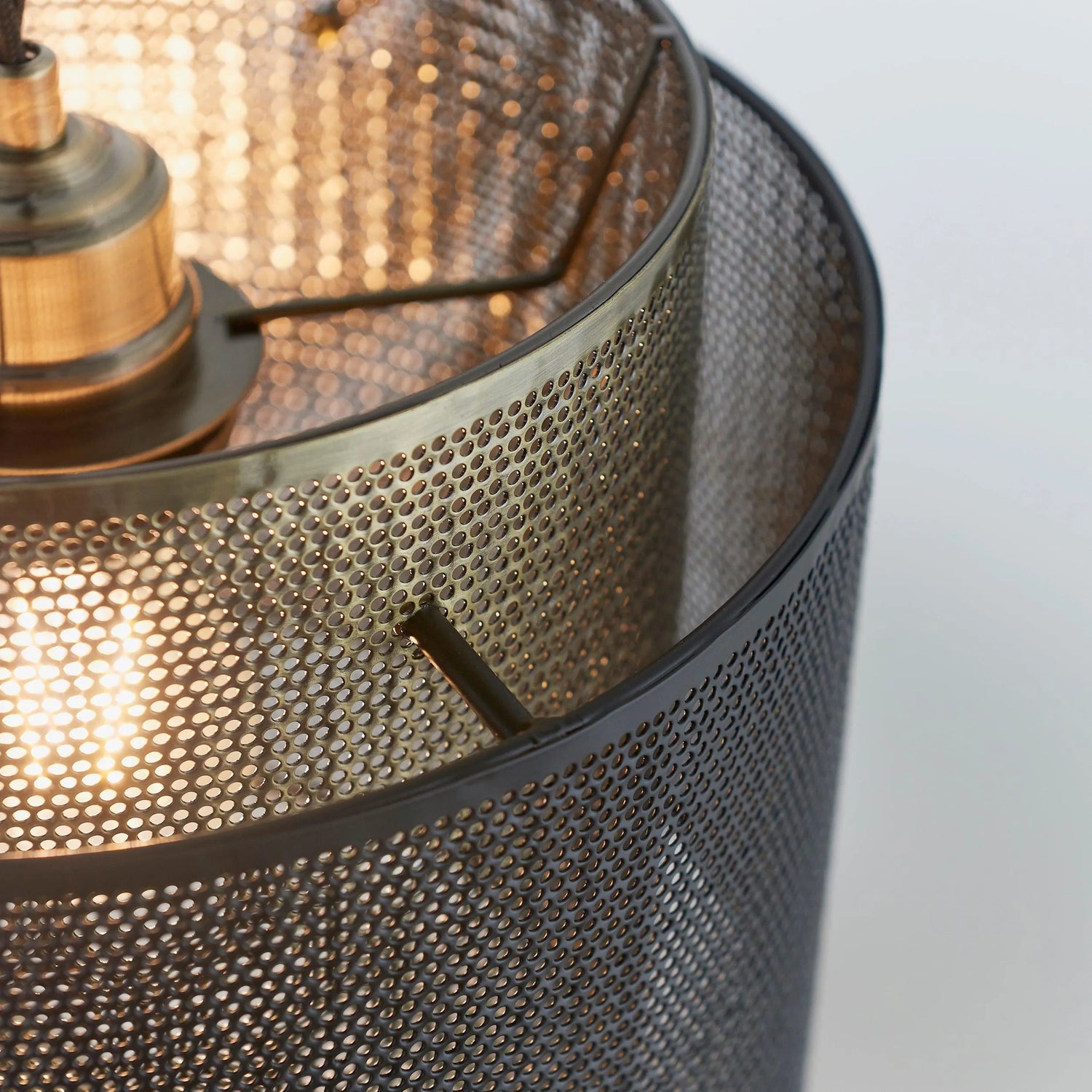 A modern pendant light formed from 2 metal etched cylinder shades, one finished in antique brass effect plate and the outer one in matt black. The mesh style shades create an interesting light effect. Compatible with LED lamps.