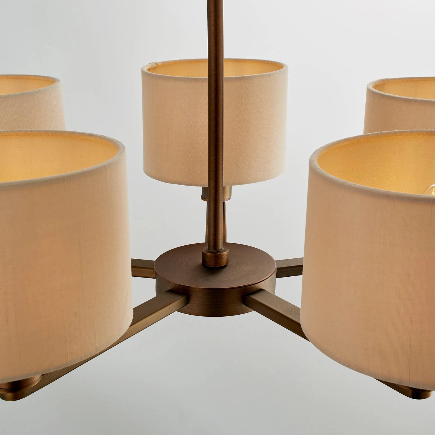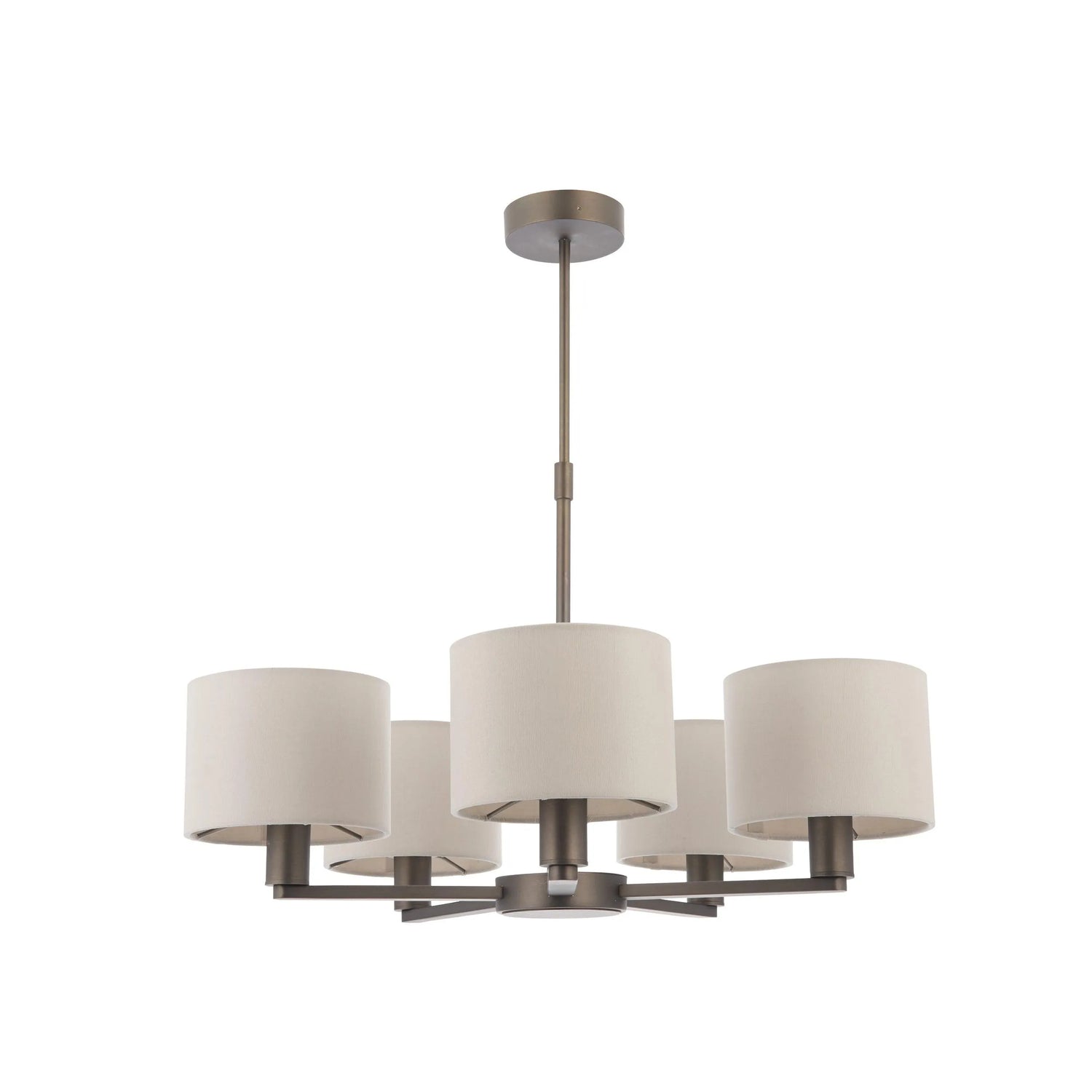 An understated modern 5 light pendant, mixing a sophisticated dark antique bronze plated finish with marble faux silk shades. Modern styling for today's interiors. Matching items also available.