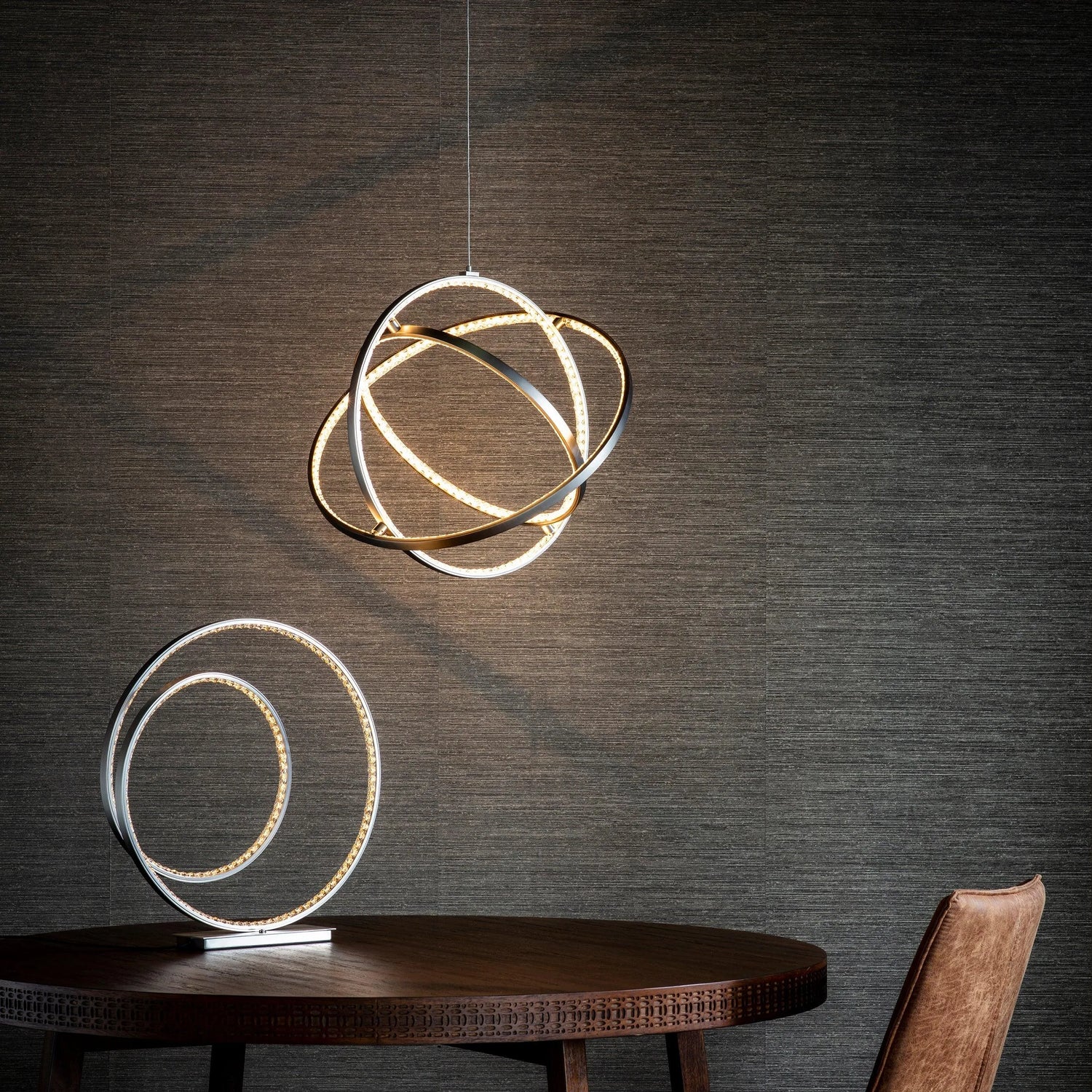 Contemporary LED ceiling pendant with three hoops of LED lights diffused through K5 crystals. Perfect for modern interiors and plated in a sophisticated matt nickel finish. The impressive loop design is an amazing centrepiece to any interior, creating an striking light effect.