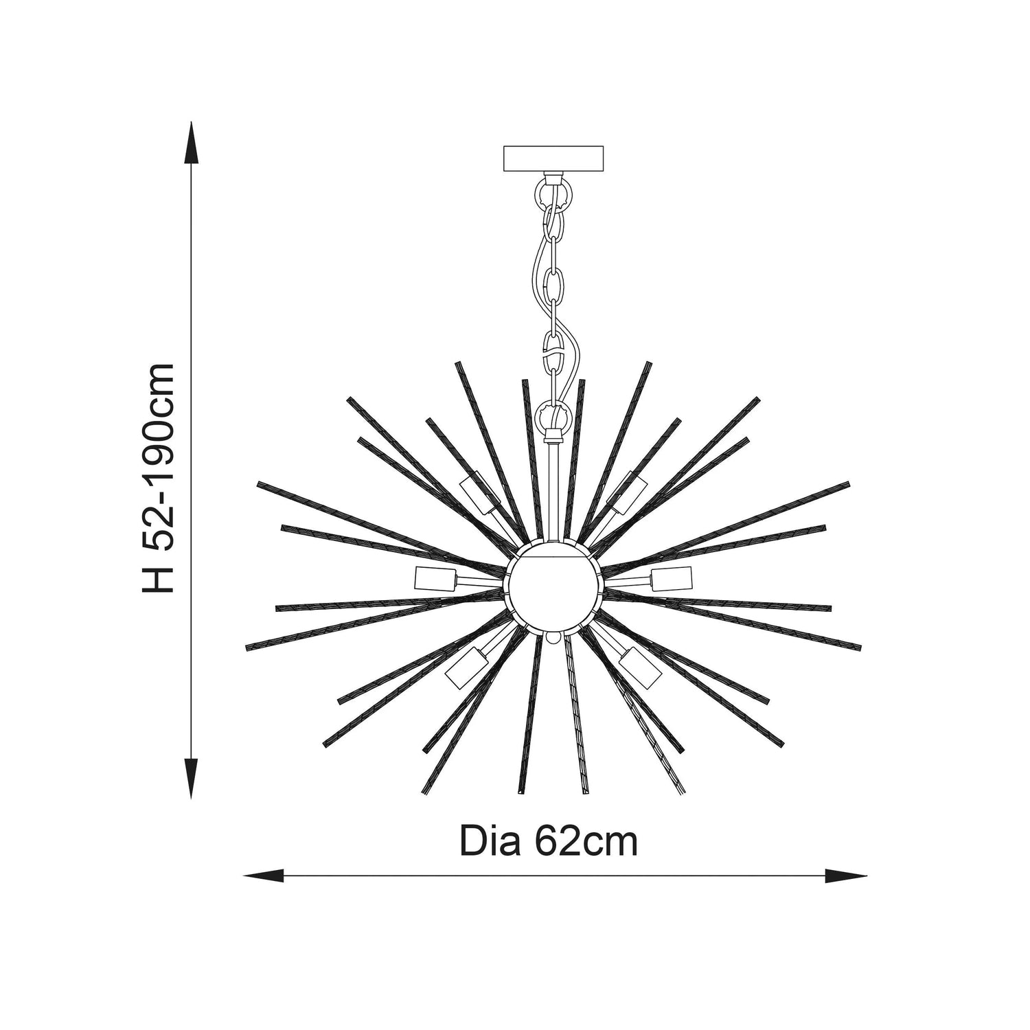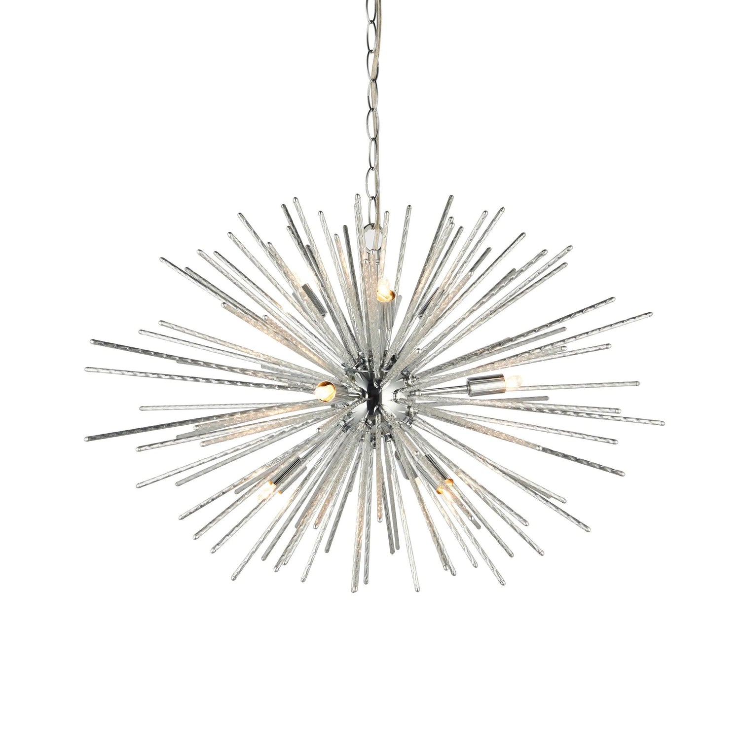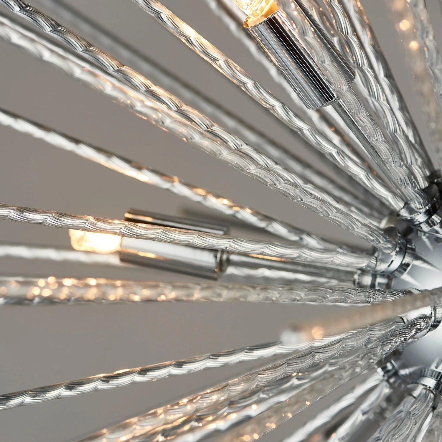 A modern version of a timeless classic from the past, finished in polished chrome featuring an 'explosion' of textured rods that create dramatic light patterns. Suspended from a height adjustable chain with clear flex, be brave and add this to modern or classic interiors to achieve that 'WOW' look...