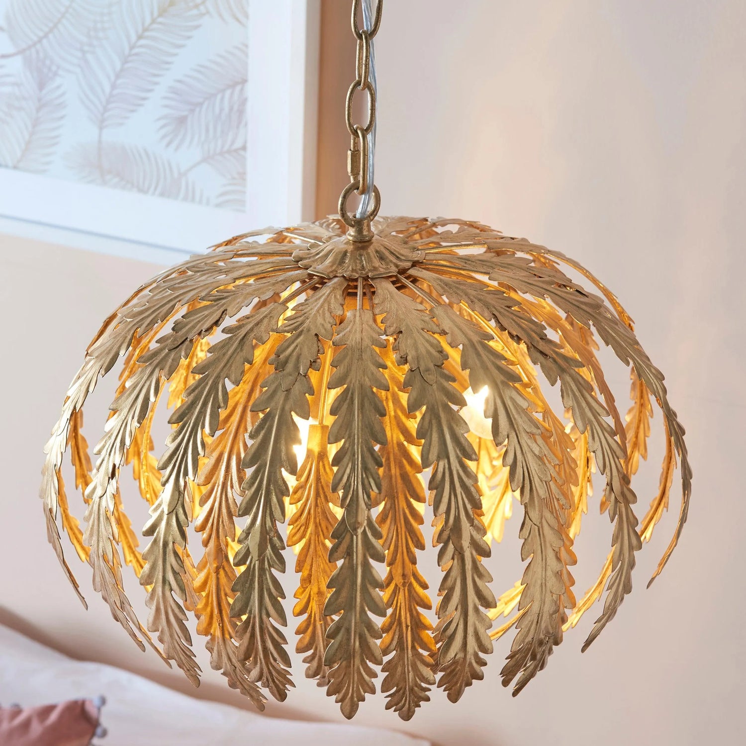 An opulent and ornate gold leaf finished floral pendant light, formed from long floral leaves and suspended from height adjustable chain. Add some gold glamour to your interior, perfect when paired with LED filament lamps to create striking light patterns.