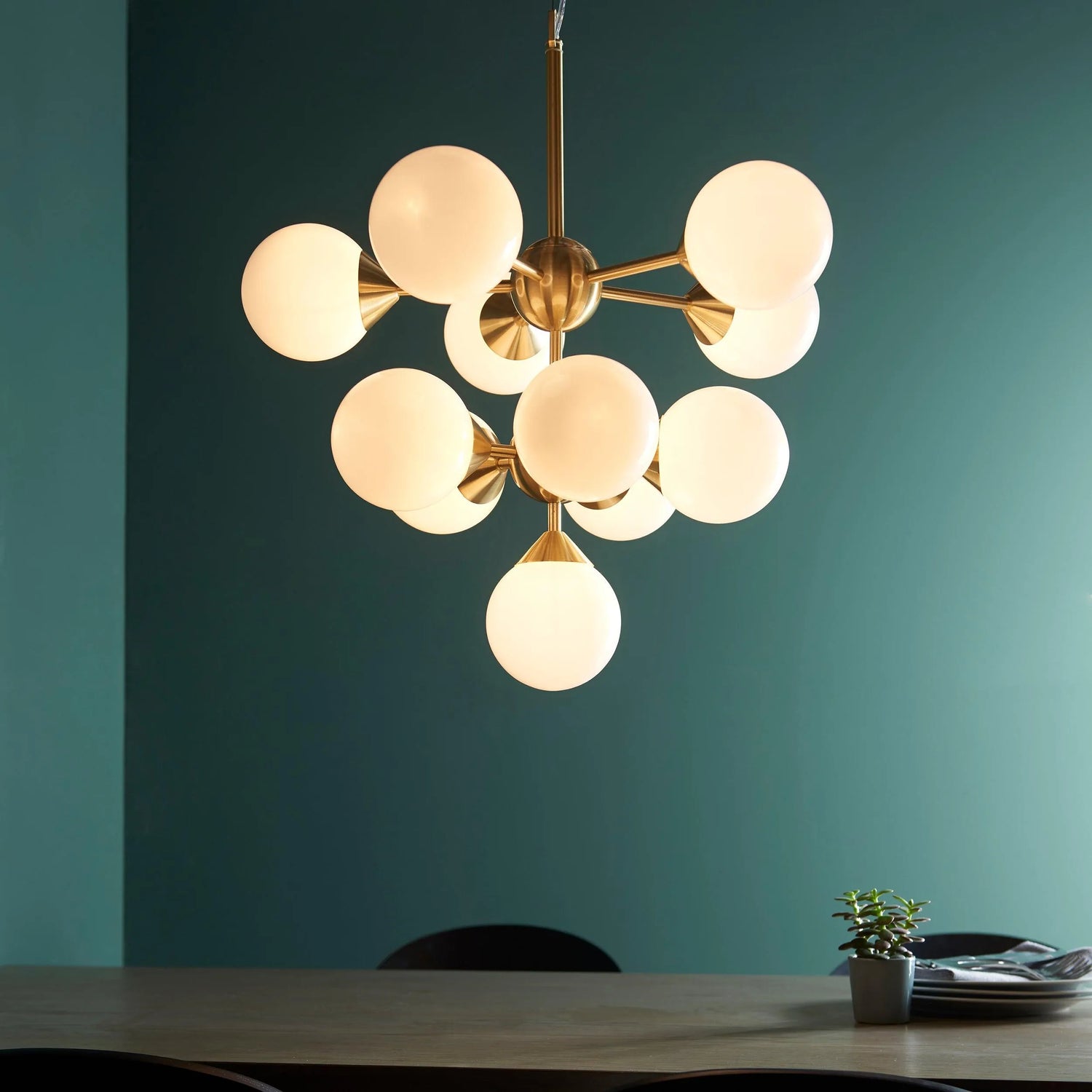 A timeless and modern design with a 'mid-century' feel, this impressive pendant is at home in modern or classic interiors. Finished in an 'on-trend' brushed brass finish with gloss white glass shades and suspended from height adjustable thin wire cable with clear flex.