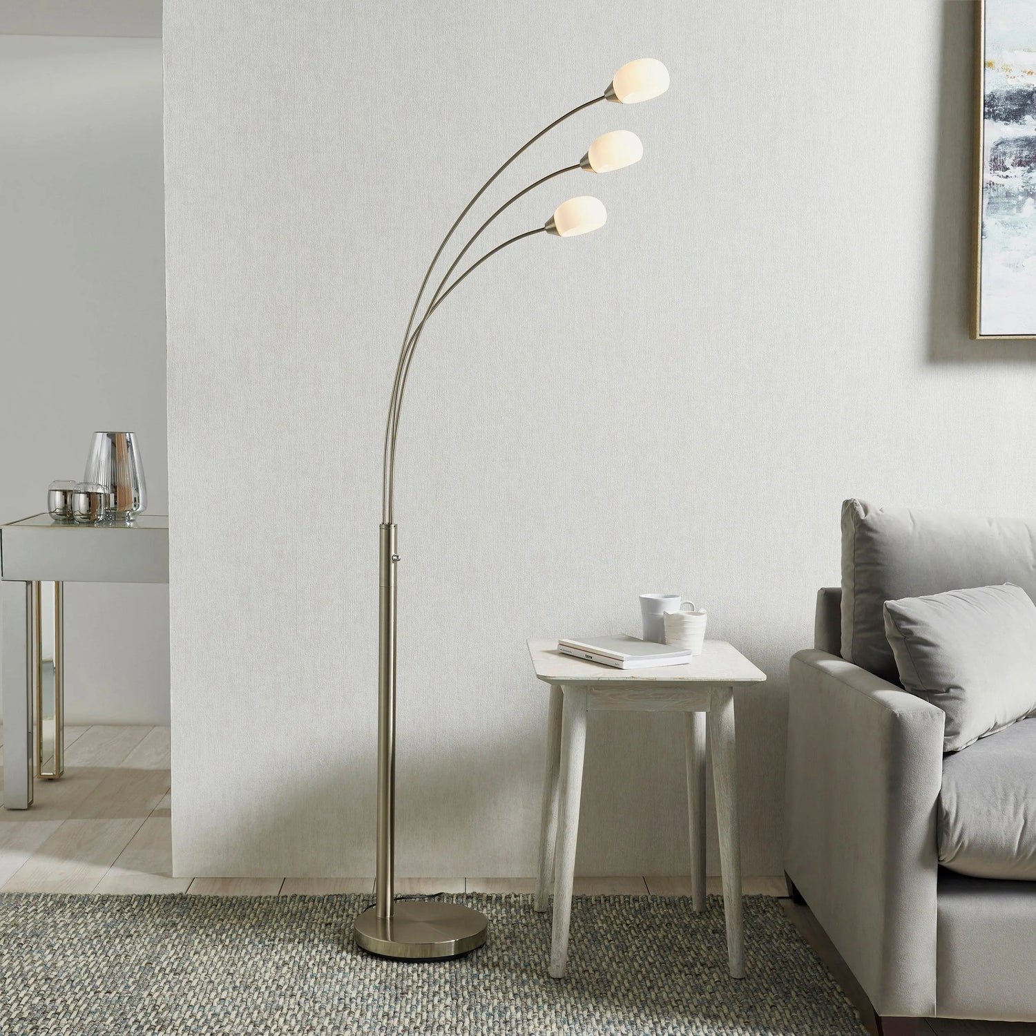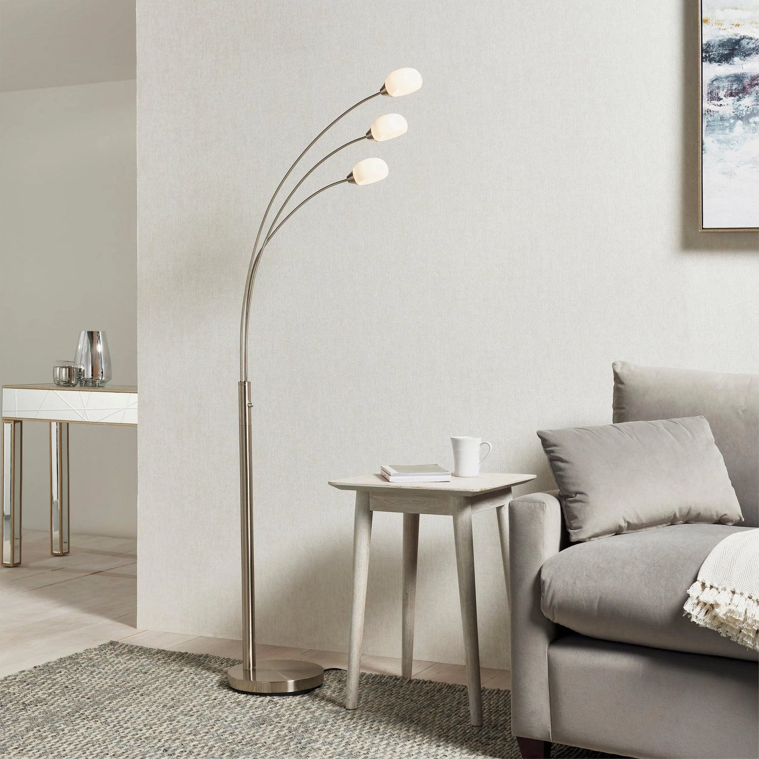 Amazing multi arm integrated LED floor lamp finished in a sophisticated satin nickel finish with white glass shades. An up to date version of an iconic classic style. Featuring a rotary dimmer on /off switch, located centrally for easy light control.
