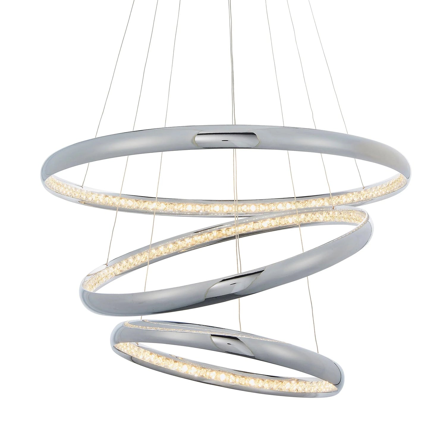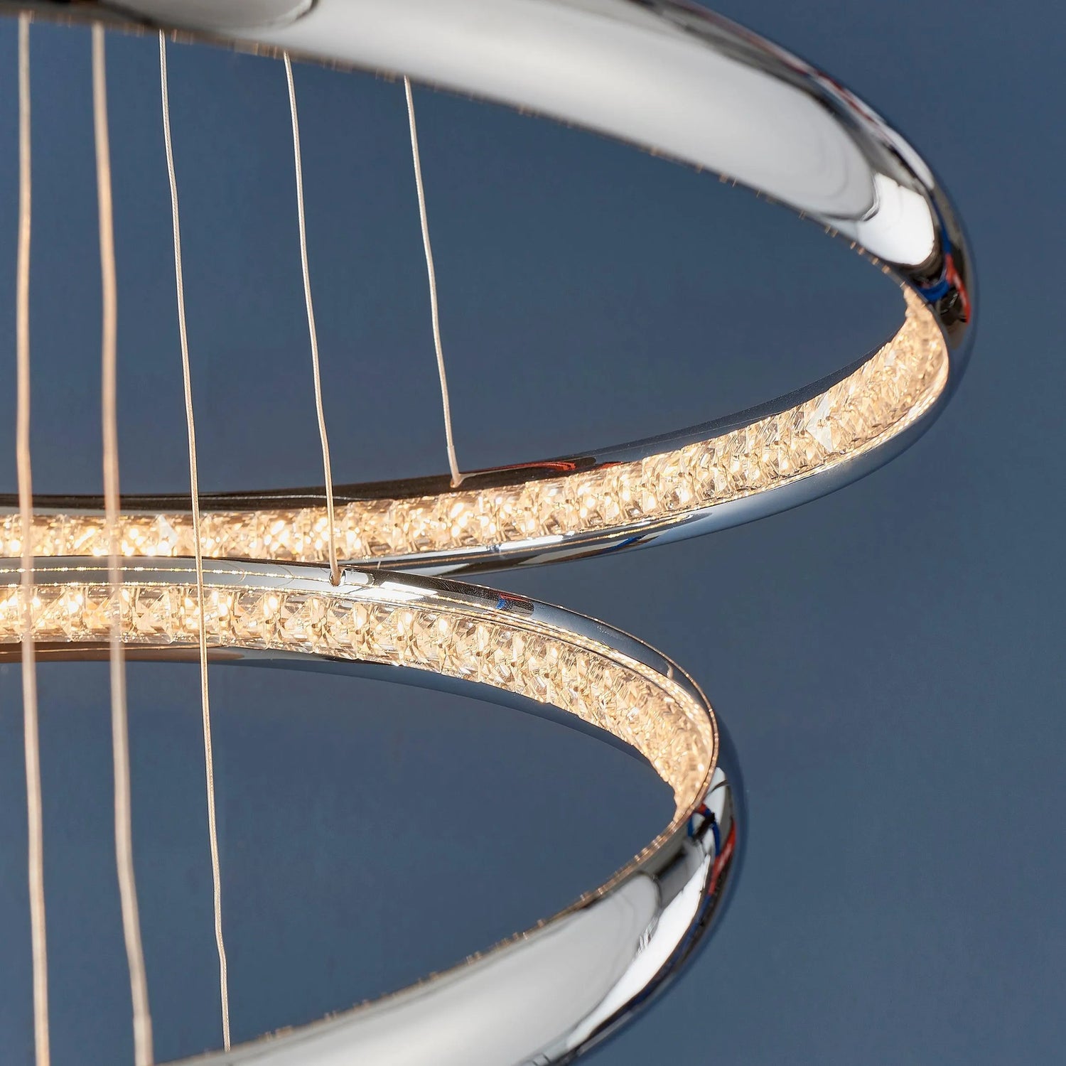 An impressive contemporary multi hoop LED pendant. Polished chrome concentric circles enclose clear crystals that diffuse the integrated LED light, creating a stunning modern design. Delicately suspended from height adjustable clear cables.