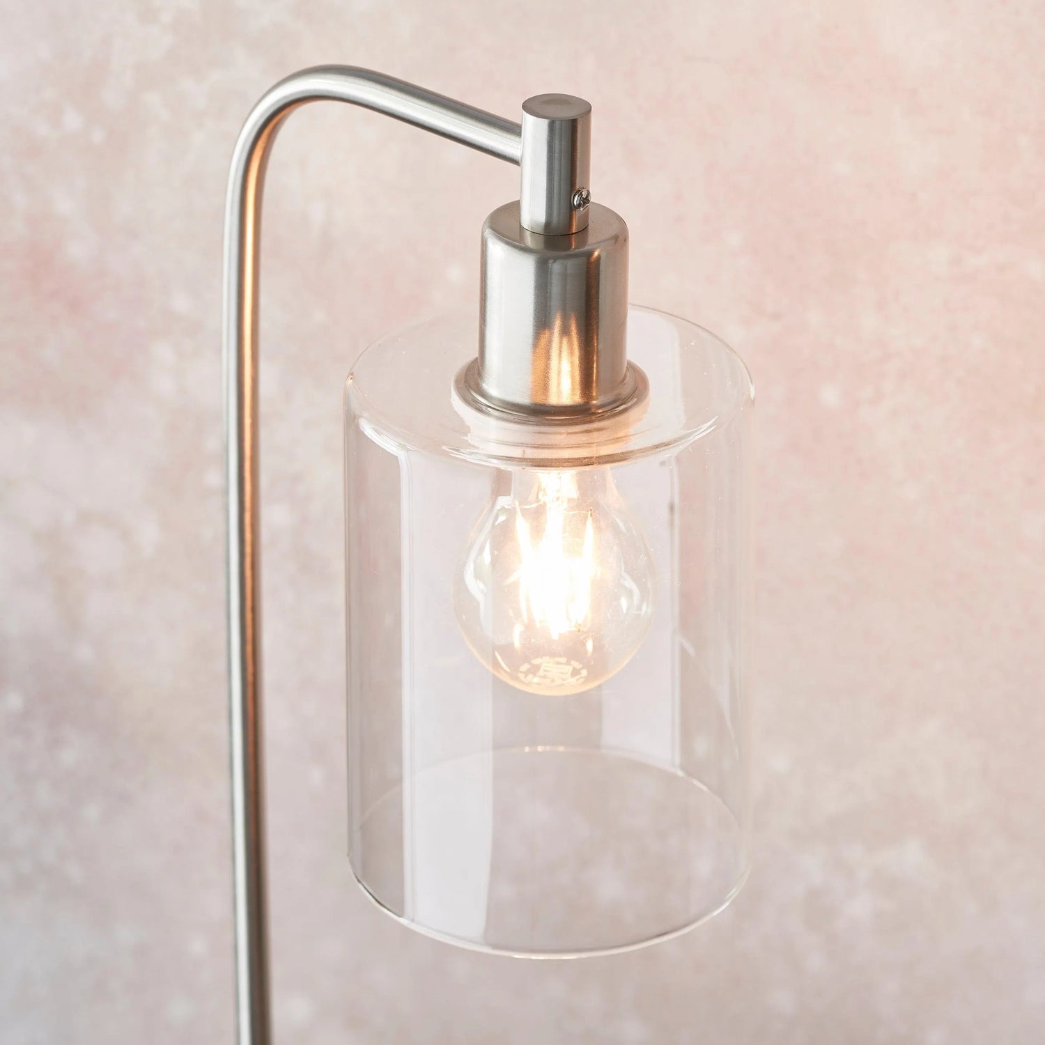 A modern table light for contemporary interiors. Brushed nickel finish with clear glass shade and inline switch.