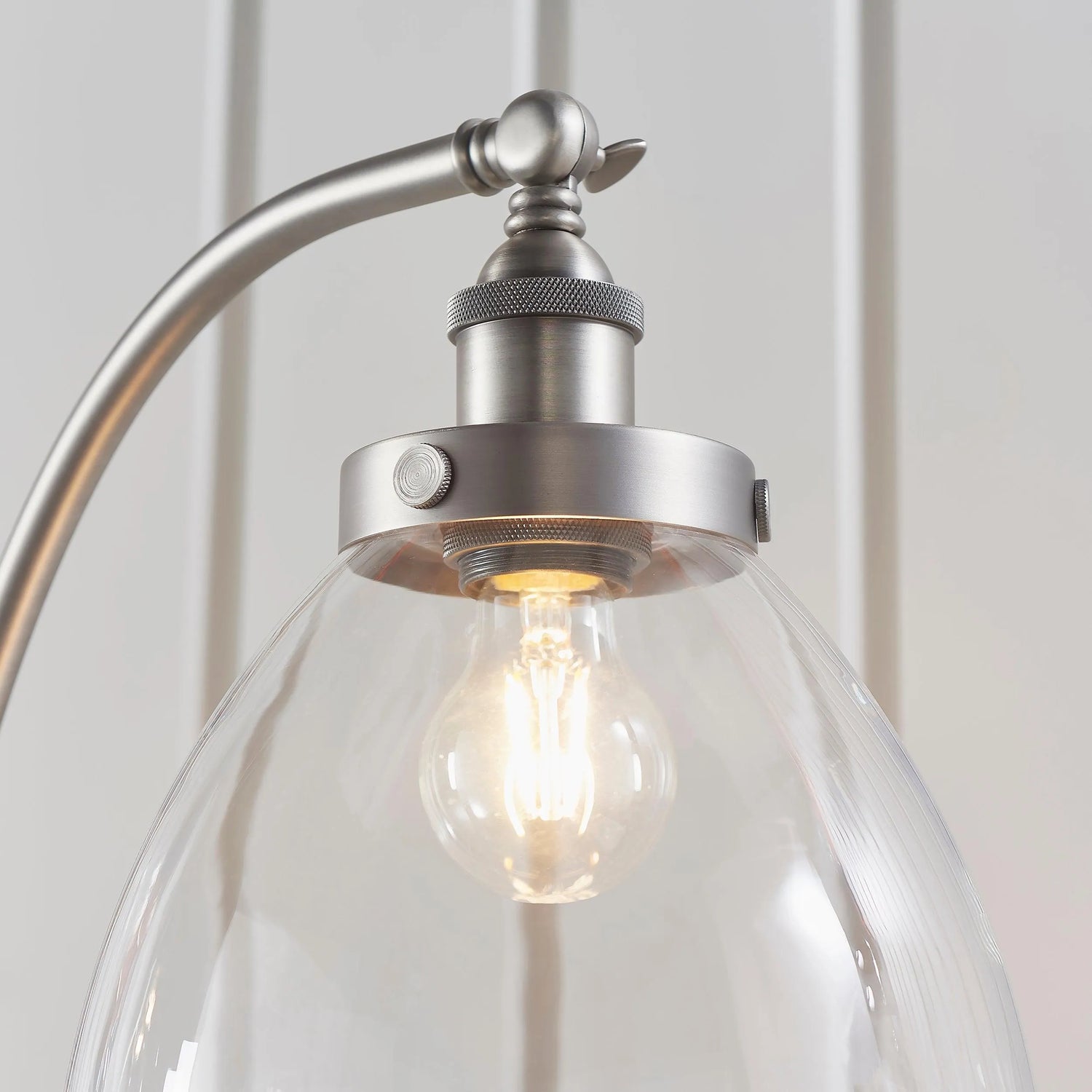An authentic 'resto' style adjustable floor lamp, finished in brushed silver paint with authentic knurled lamp holder details and clear glass shades. Featuring an adjustable knuckle and accessible on/off switch, pair this table light with filament LED lamps for that perfect industrial style. The perfect addition for today's stylish homes to create that on trend bar, bistro look.