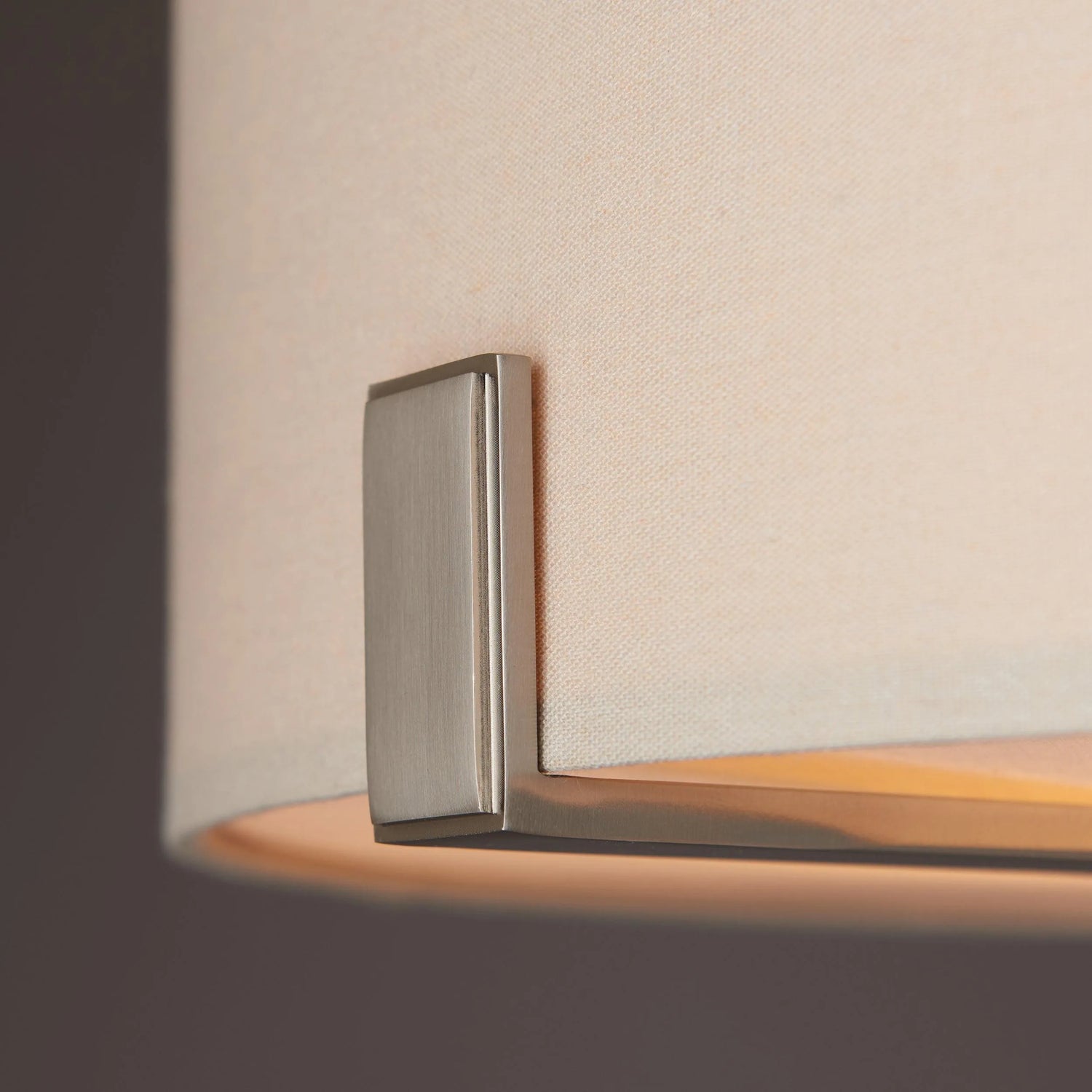 Luxurious, sophisticated ceiling light with understated metalwork in a classic satin nickel plated finish. Complemented by a timeless pale grey shade complete with anti-glare fabric diffuser. Height adjustable via a versatile telescopic central stem.