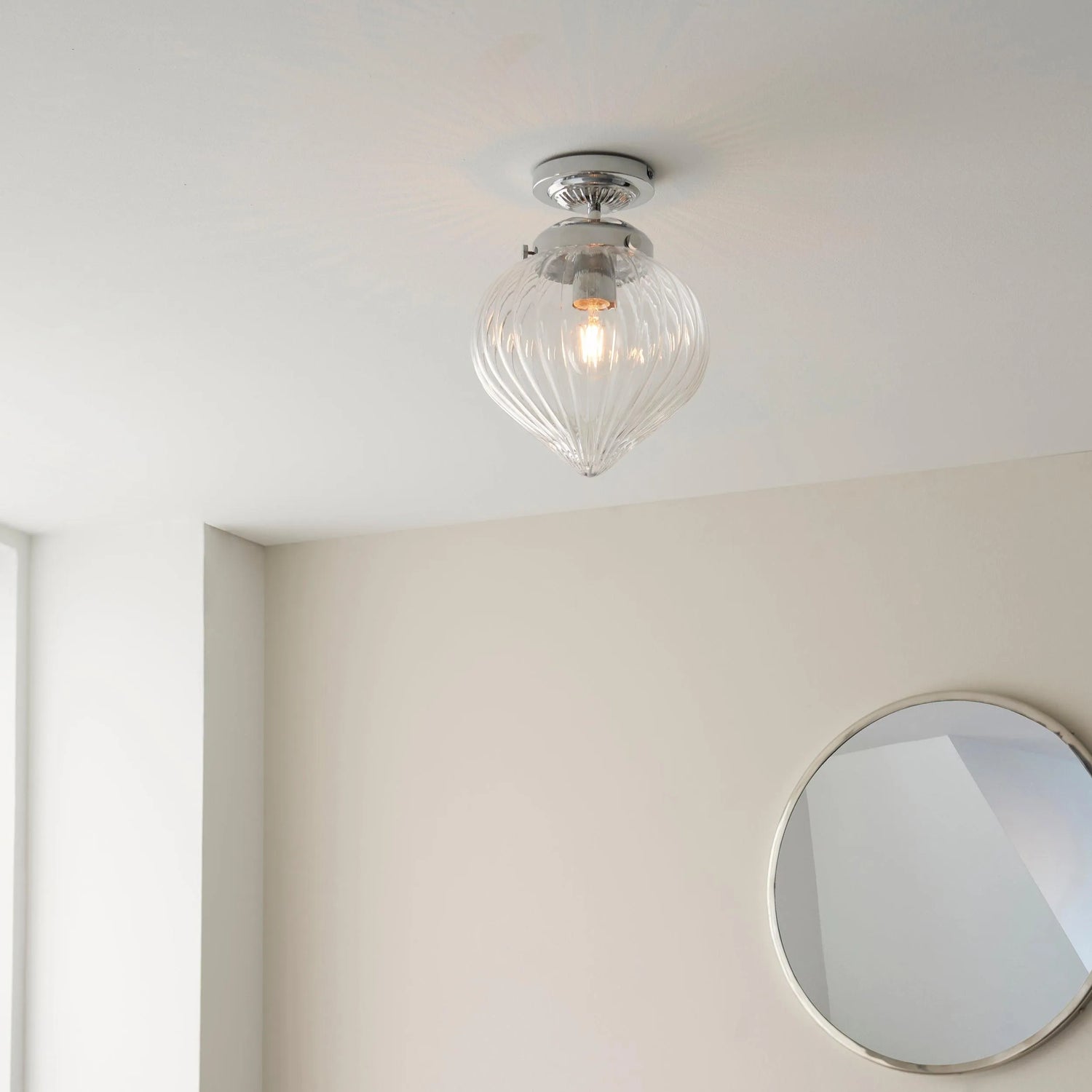 Timeless ceiling light to provide the perfect final touch to a bathroom. With clear ribbed glass shade and chrome finish metal work this light can be dimmed to create a relaxing environment in your bathroom. Perfect for use with E27 LED lamps.