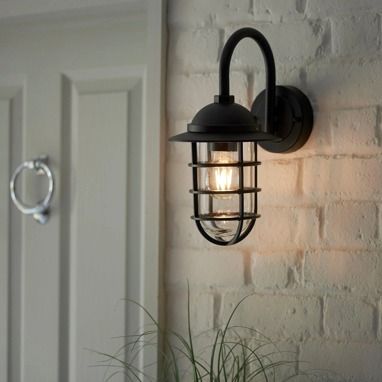 Modern classic exterior light with caged metal work over a clear glass shade; perfect for use with E27 LED filament lamps. Corrosive resistant and IP44 rated perfect for enduring the UK weather.