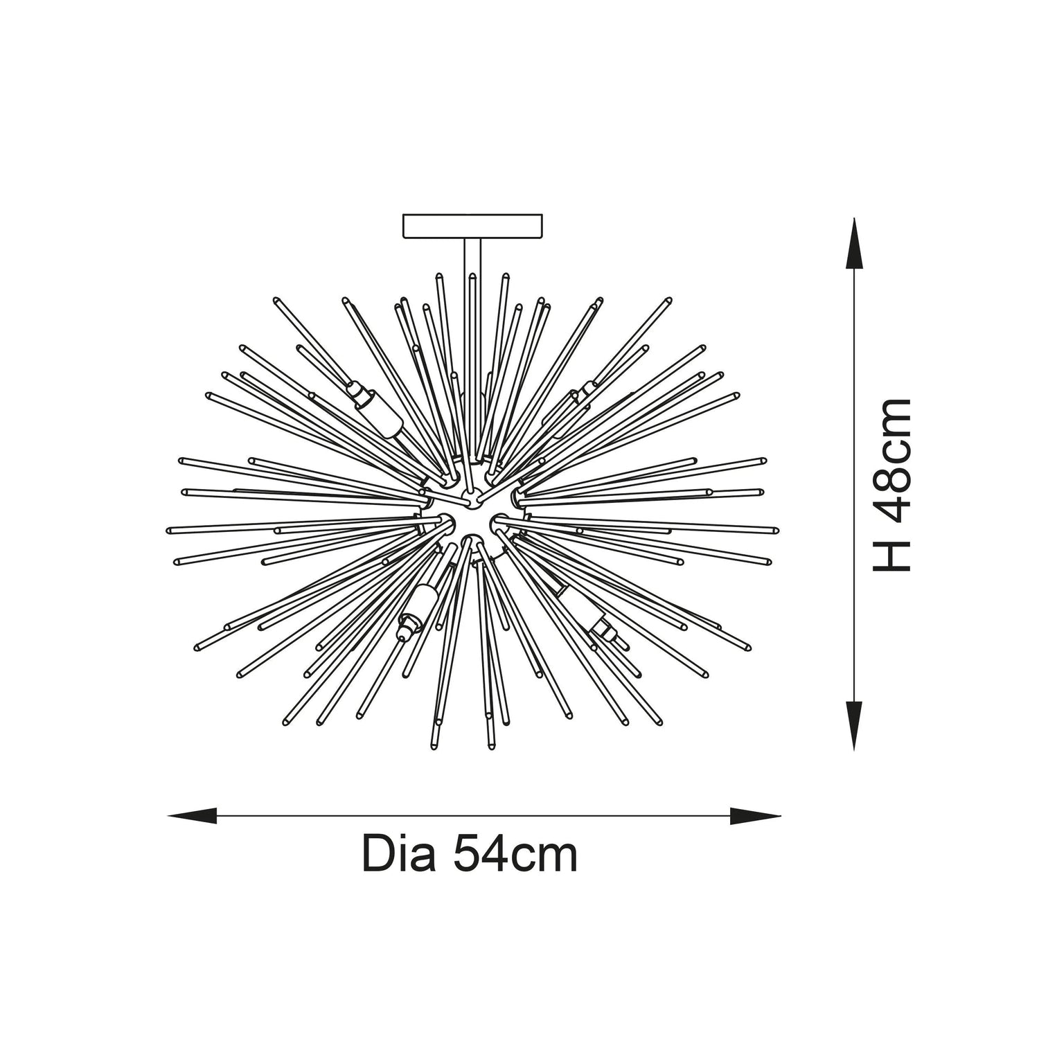 Following the 70's trend this Sputnik style semi flush light is finished in satin gold finish. 6 lights are scattered among the metal spikes creating a stunning centrepiece. This product is fully dimmable. Matching pendant also available.