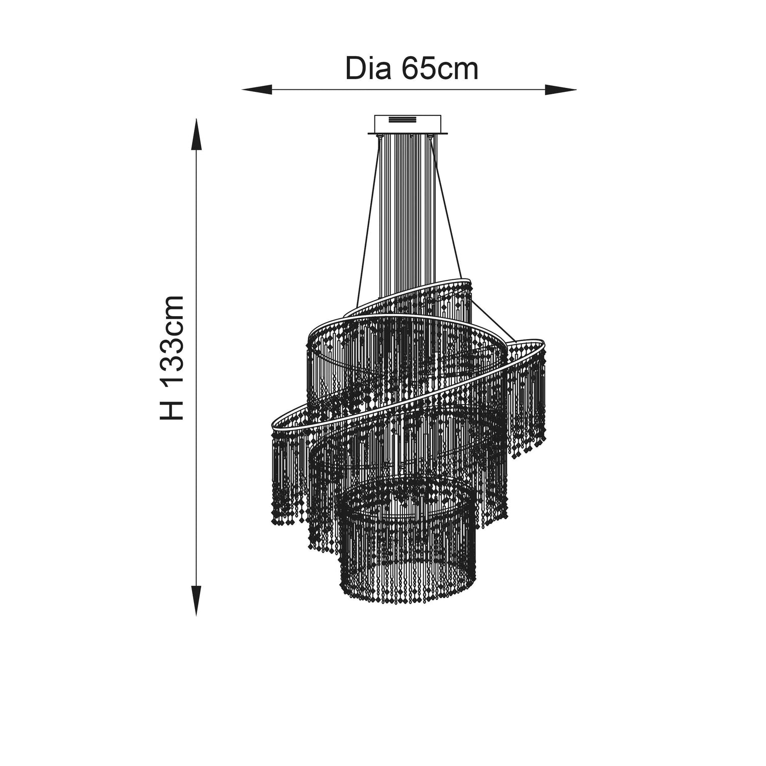 An impressive 24 light chandelier adorned with a mix of delicate slender glass rods and faceted glass beads cascade throughout the multi ring pendant, creating a stunning centre piece.