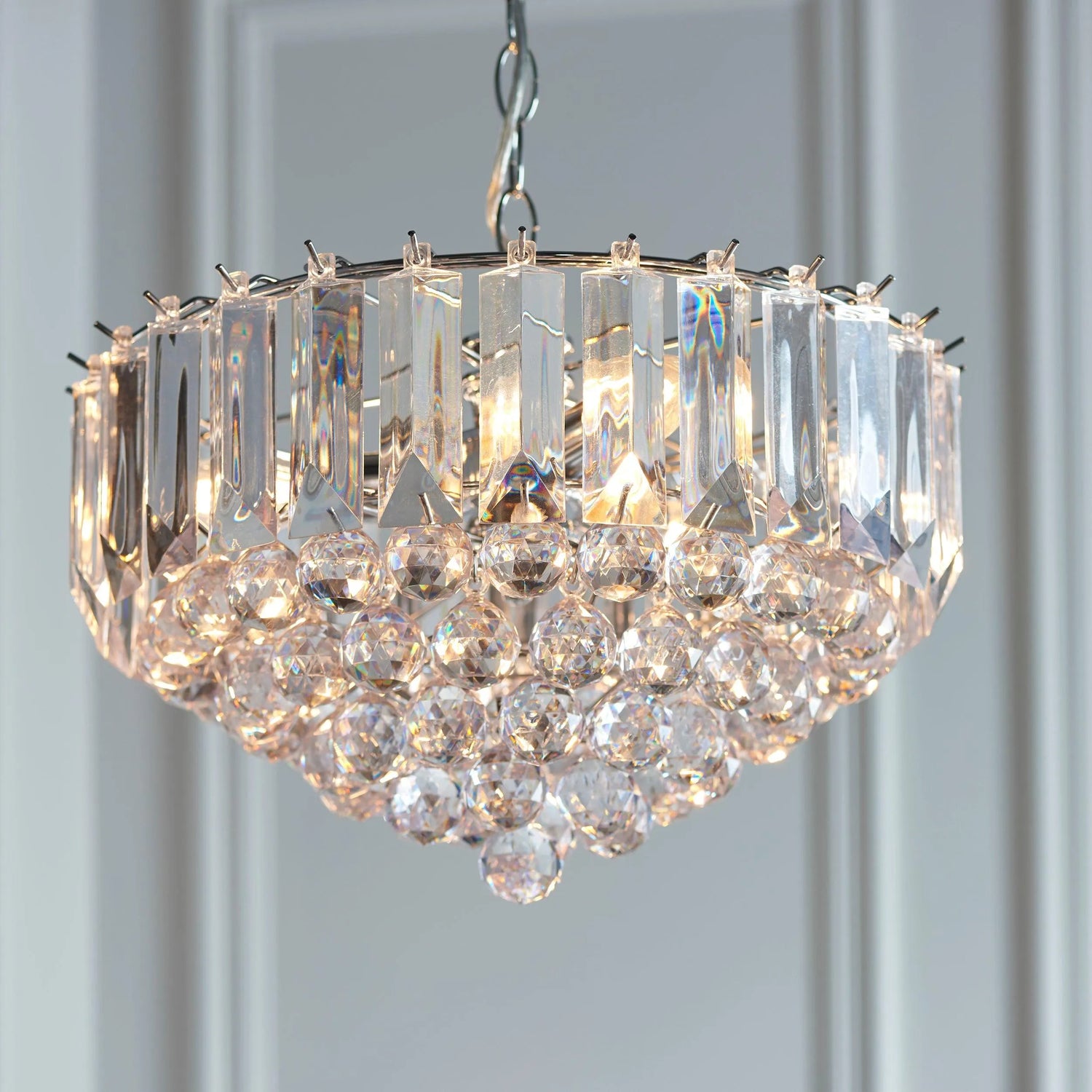 The Fargo pendant is finished in chrome effect with clear acrylic detailing. This fitting has a height adjustable drop, is dimmable and suitable for use with LED lamps. Other fittings and finishes also available within the range