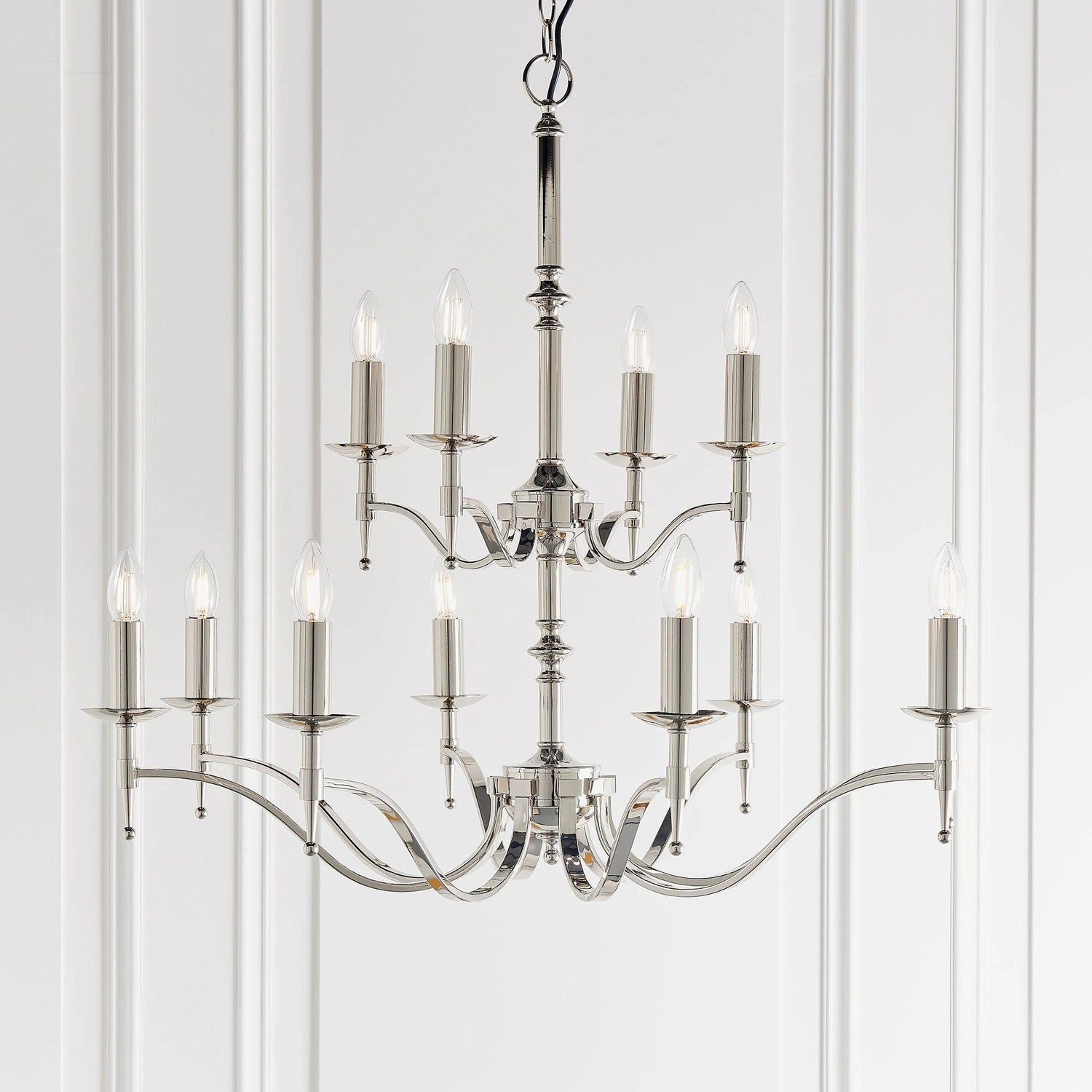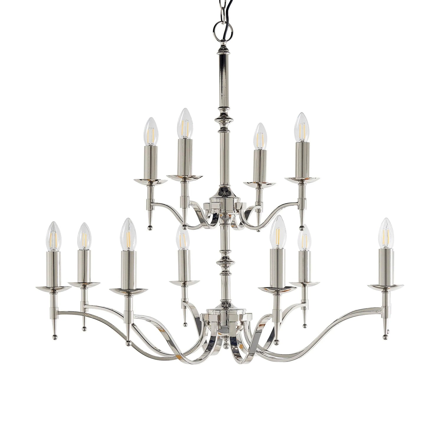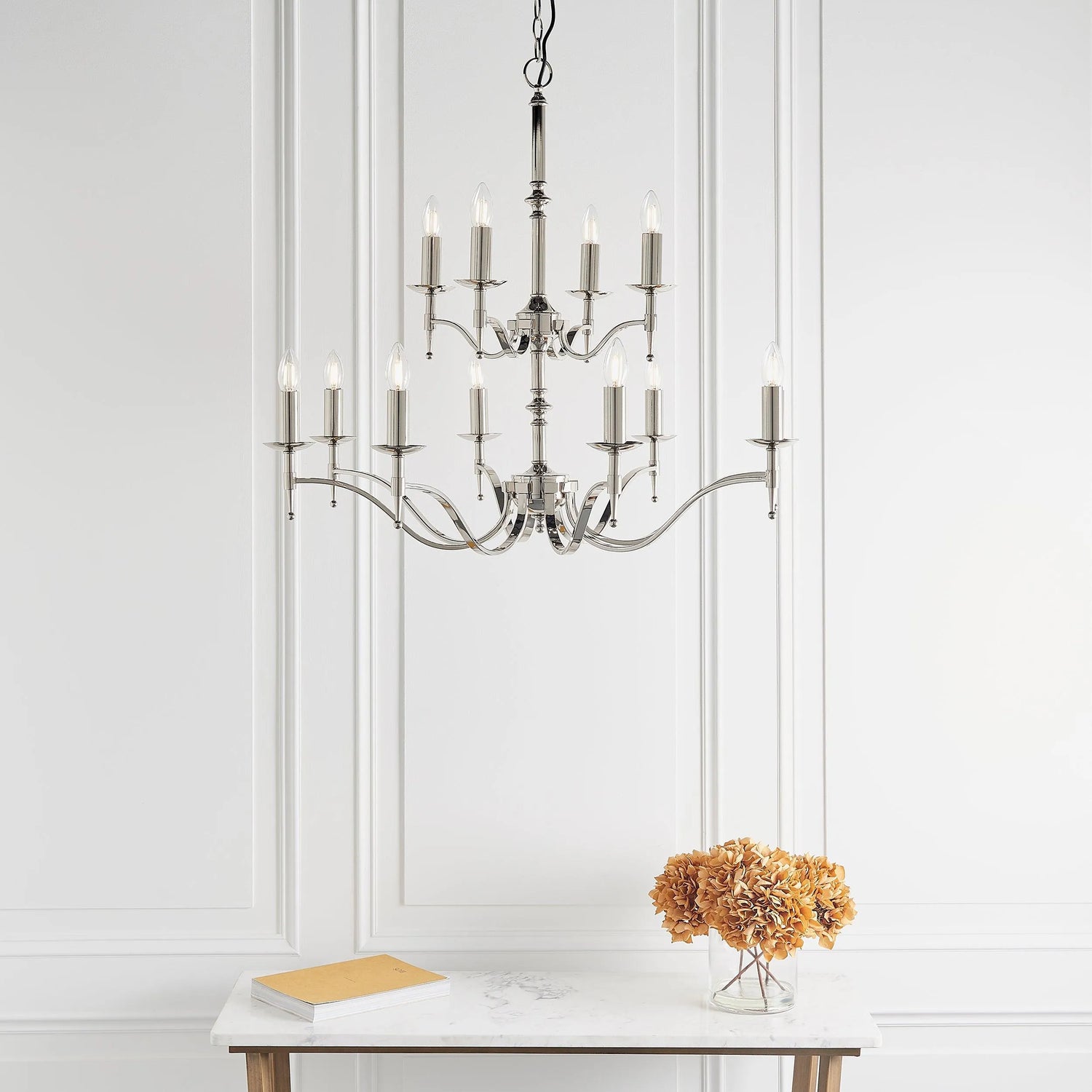 The Stanford Nickel 12-light pendant is an impressive chandelier fitting. Finished in polished nickel plate with angular arms giving it a classical twist on its contemporary styling. Suitable for use in living areas, hallways and reception rooms. Looks especially effective when teamed with decorative filament candle lamps. Available in a choice of sizes and fittings