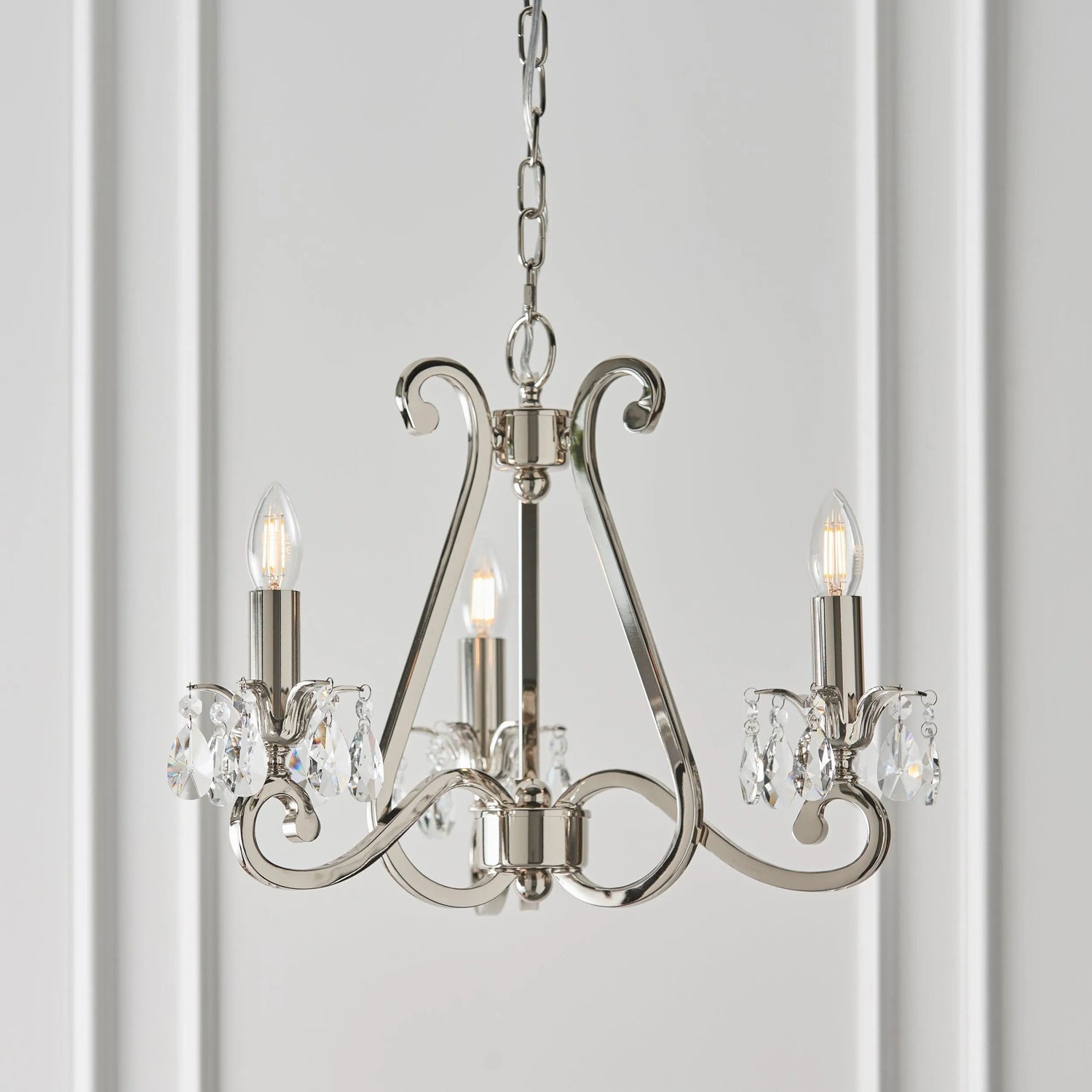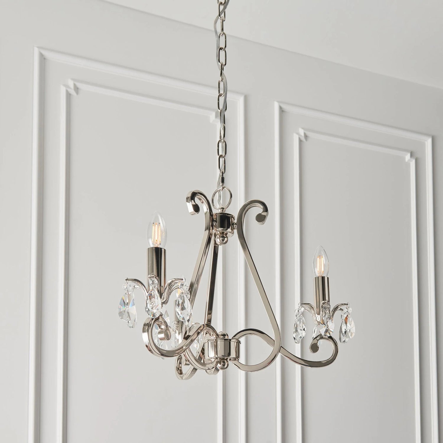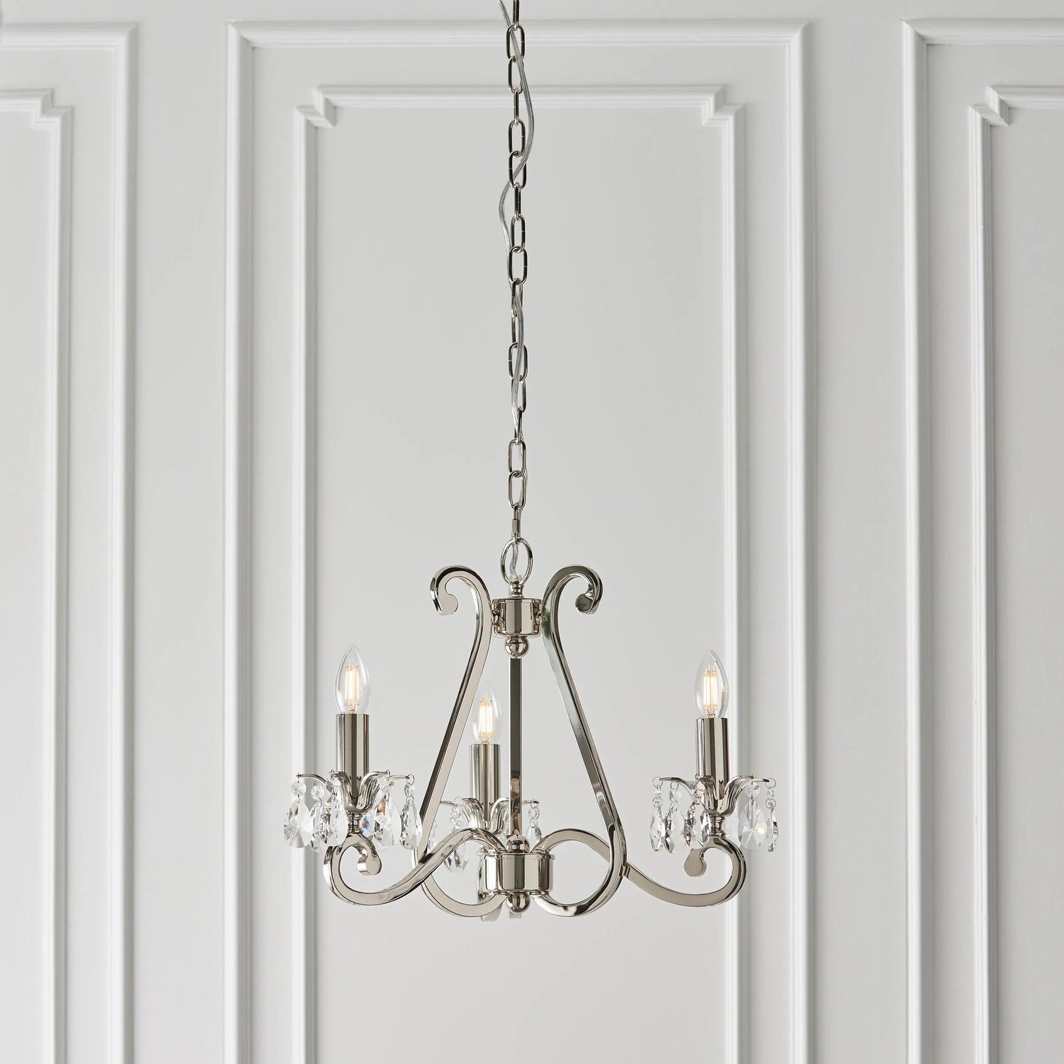 A 3 light pendant from the Oksana nickel range. Features faceted lead crystal droplets around the lamp holder on each decorative arm. Matching items available and compatible with LED lamps