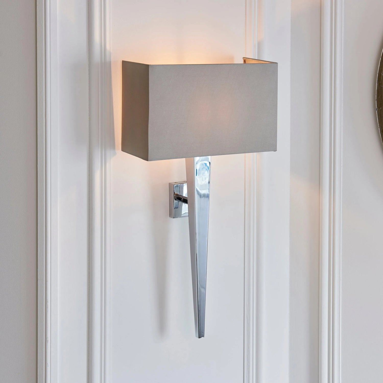 This wall light has a mirrored stem finished in polished chrome topped with an angular grey faux silk shade. Dimmable and suitable for use with LED lamps. Matching items available