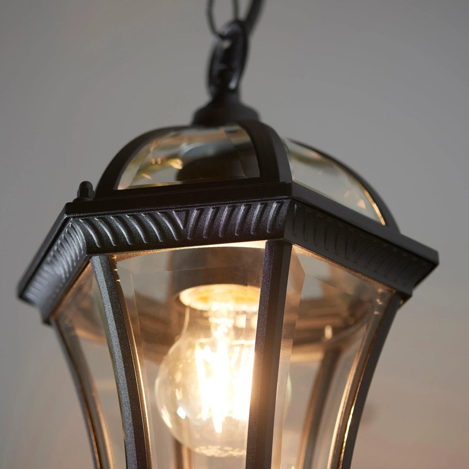 A traditional die cast aluminium hanging lantern with a matt black finish. It is IP44 rated so is suitable for outdoor use, and both dimmable and suitable for use with LED lamps. Others available in this range