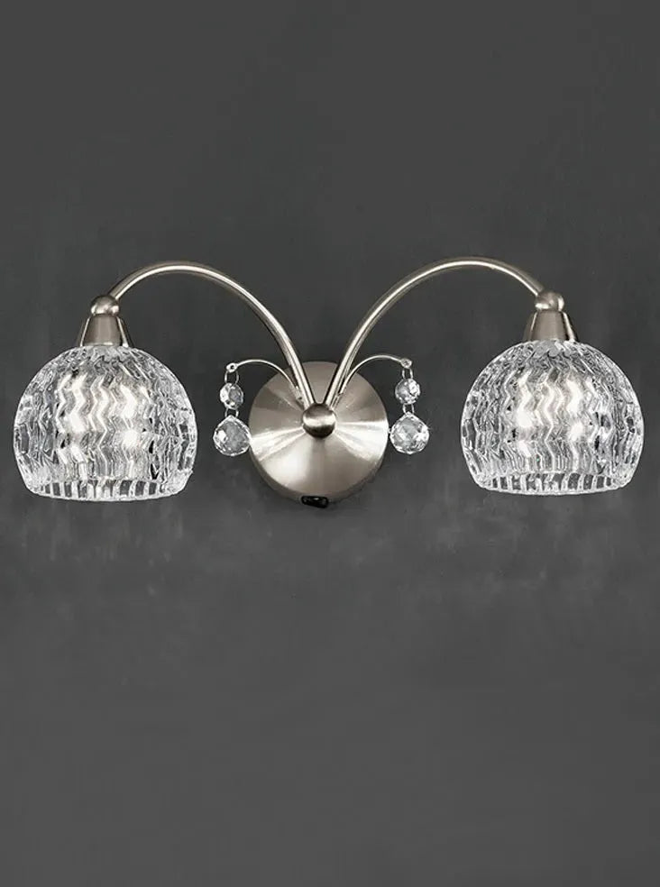 Satin nickel finish fittings with small cut glass bowls and faceted crystal drops. Supplied with mains voltage lamps which are suitable for dimming.