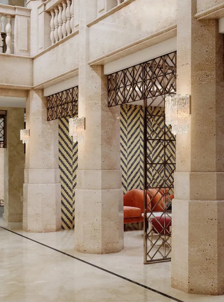 Aged brass finish wall light with ice cubed shaped glass panels at varying heights that refract the light.