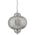 This Moroccan style Fretwork pendant light will make a real style statement in any home. Finished in shiny nickel with a patterned circular design and a pointed base, this ceiling fitting is perfect for over table lighting in a dining room or kitchen. The Moroccan light is punctured so the light projects through brightly causing slight patterned shadows