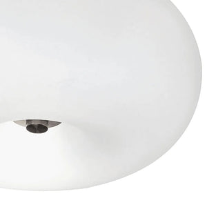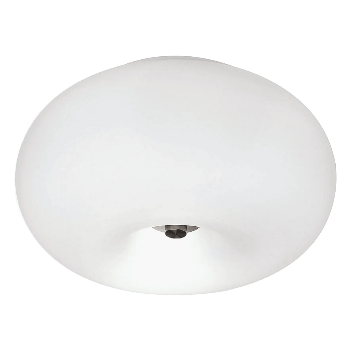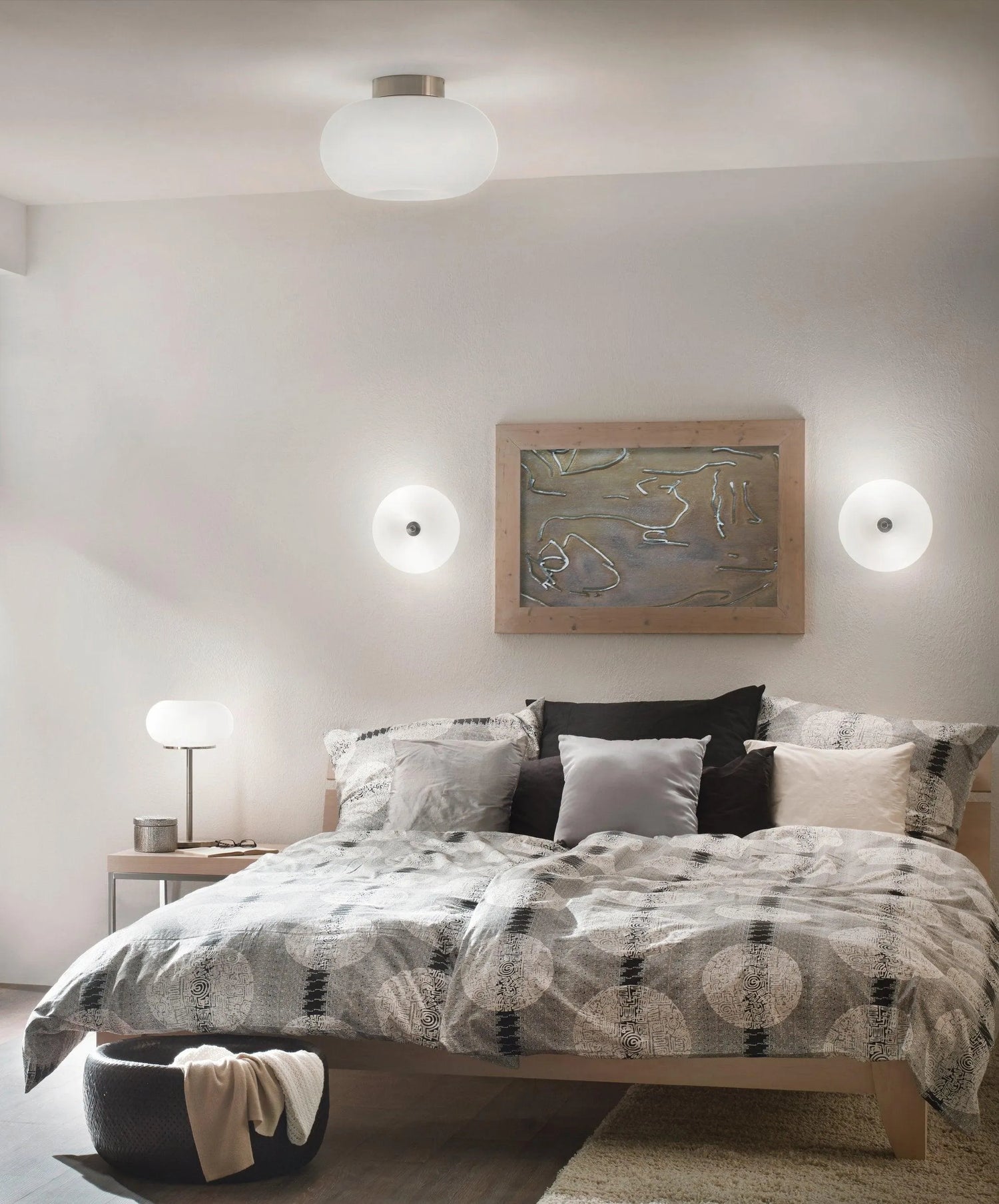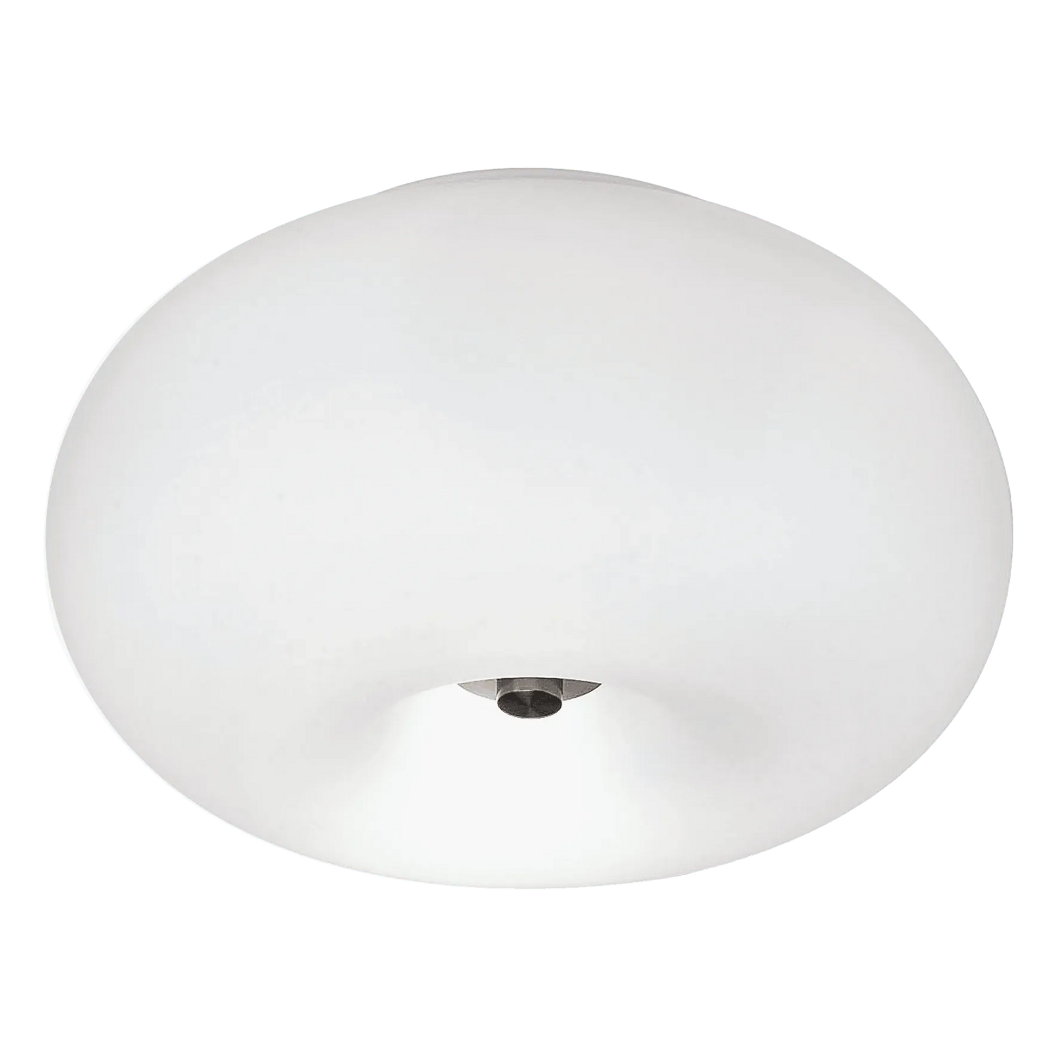 This wall or ceiling luminaire from the series OPTICA is made of satin nickel steel and white, opal-matte glass. The spotlight needs two E27-lamps.