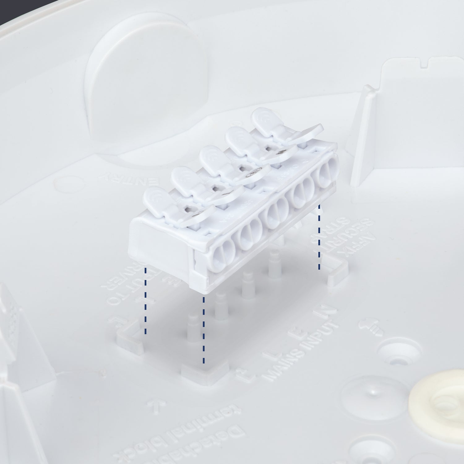2.5x Faster to install than traditional LED bulkheads Detachable terminal, for simple wiring connection Multiple cable entry, central and offset rear entry points 20mm conduit entry, on top, bottom, sides and rim Clip-in tool-less LED gear tray design Smooth, even light distribution IK10, maximum impact rating IP65 protection against dust and moisture Emergency, microwave and dimmable options Complete with white rim as standard
