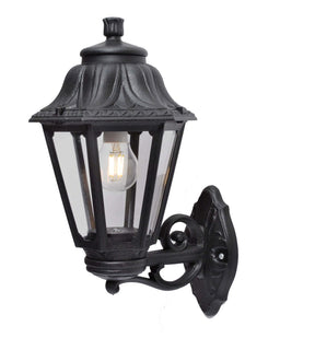 Part of the Fumagalli Anna range, this E27 hexagonal wall lantern in classic style is made of shockproof resin material, UV-rays stabilized, rust and corrosion-free. Insulation class II, protection rating IP55. This Wall lantern has a multi-way system which can be reversed from Upturned to Downturned wall light.