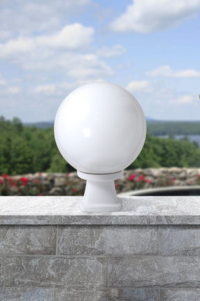 250 mm PMMA globe, complete with modern globe base made of shockproof resin material, UV-rays stabilized, rust and corrosion-free. Suitable for post top or wall installation. Supplied as optional with TÜV-CB certified, long-life and efficient LED lamps suitable for outdoor use. Insulation class II, protection rating IP55.
