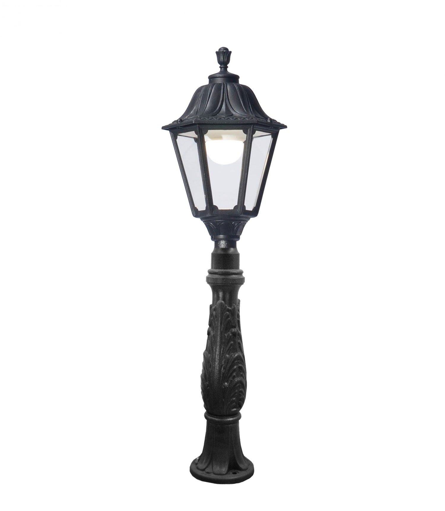 E27 (High Power LED) hexagonal lantern in classic style, complete with classic black post, made of shockproof resin material, UV-rays stabilized, rust and corrosion-free. Modular construction suitable for post top, hanging and wall installation. Provided with high temperature resistant ceiling suitable for ballast fixation. Insulation class II, protection rating IP55.
