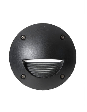 Round recessed wall fitting with eyelid cover with grill, made in shockproof resin material, UV rays stabilized, rust and corrosion-free. This fitting is a surface mounted wall light fitting ideal for illuminating steps and pathways. Supplied as standard with long-life powerful and efficient TÜV approved GX53 3W LED lamp.