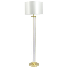 This floor lamp features a satin chrome finish with a clear glass stand. Complete with a simplistic silk shade. Classic in its style, this floor lamp is a timeless way to update your space.