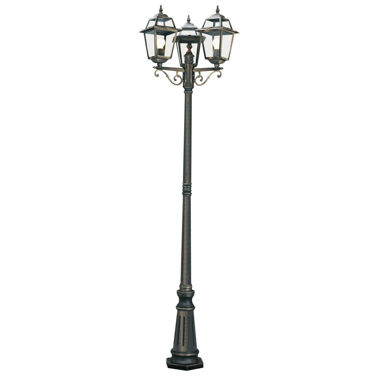 This New Orleans Black/Gold 3 Light Outdoor Post Lamp with Clear Glass brings a look of The Big Easy to your home. The traditionally designed street lamp has a tall cast aluminium post and three ornate cast aluminium lamps at the top, with clear glass to light your garden and outdoor areas. And it is IP44 rated and fully splashproof to protect against the elements.