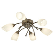 This Opera antique brass 6 light ceiling light with opal glass shades looks elegant in any living space. The traditional antique brass finish fitting has six beautifully shaped opal glass shades with curved stems, which provide a practical source of light for the entire room.