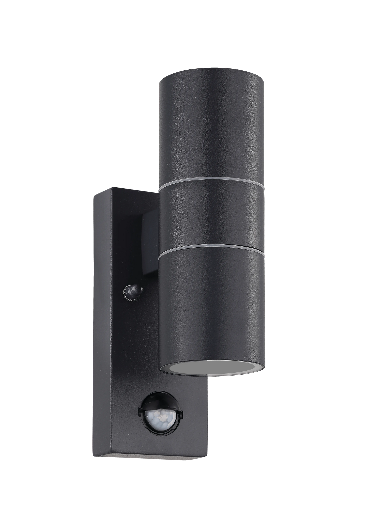The RIGA 5 exterior LED wall light has a cylindrical anthracite zinc-plated metal body with a clear glass cover at each end. The product includes GU10 LED lightbulbs, which produce a pleasant warm white light. The exterior wall light has a motion sensor and turns on automatically, lighting up poor visibility areas and deterring unwanted visitors. The integrated twilight sensor gauges the ambient light level to ensure the light only switches on when needed. The product is suitable for outdoor use due to its IP44 protection against spray water. With its modern up and down design, the light blends into almost any outdoor area and provides stylish indirect lighting for external house walls.