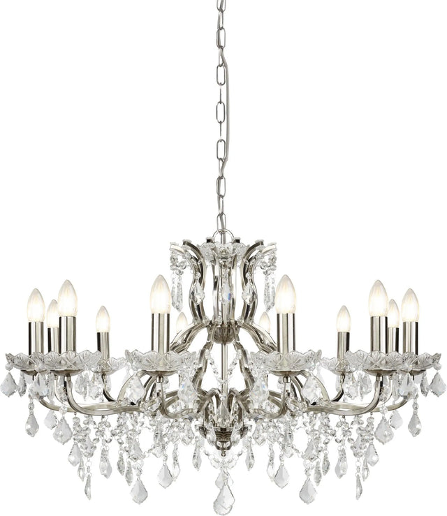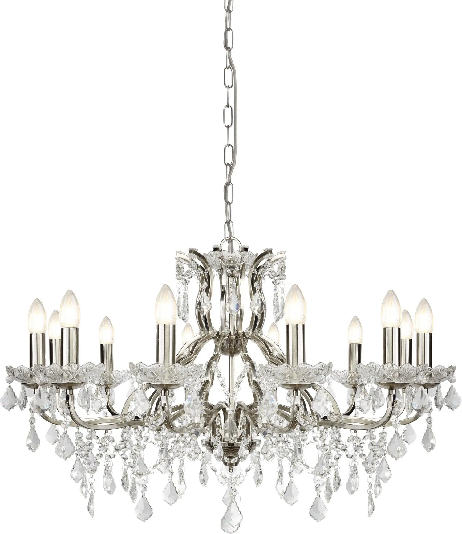 Searchlight Paris 12Lt Chandelier - Satin Silver & Clear Crystal Drops Search Light Part Number 87312-12SS