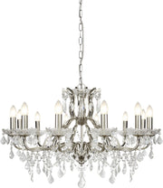 This Paris 12 light chandelier is perfect for adding a feeling of sophistication that will suit a classic home setting. 12 lights are housed in candle holders and the body is decorated with clear crystal, complete with a satin silver finish. Clear crystal drops cascade below the body and shine beautifully against the light when lit.