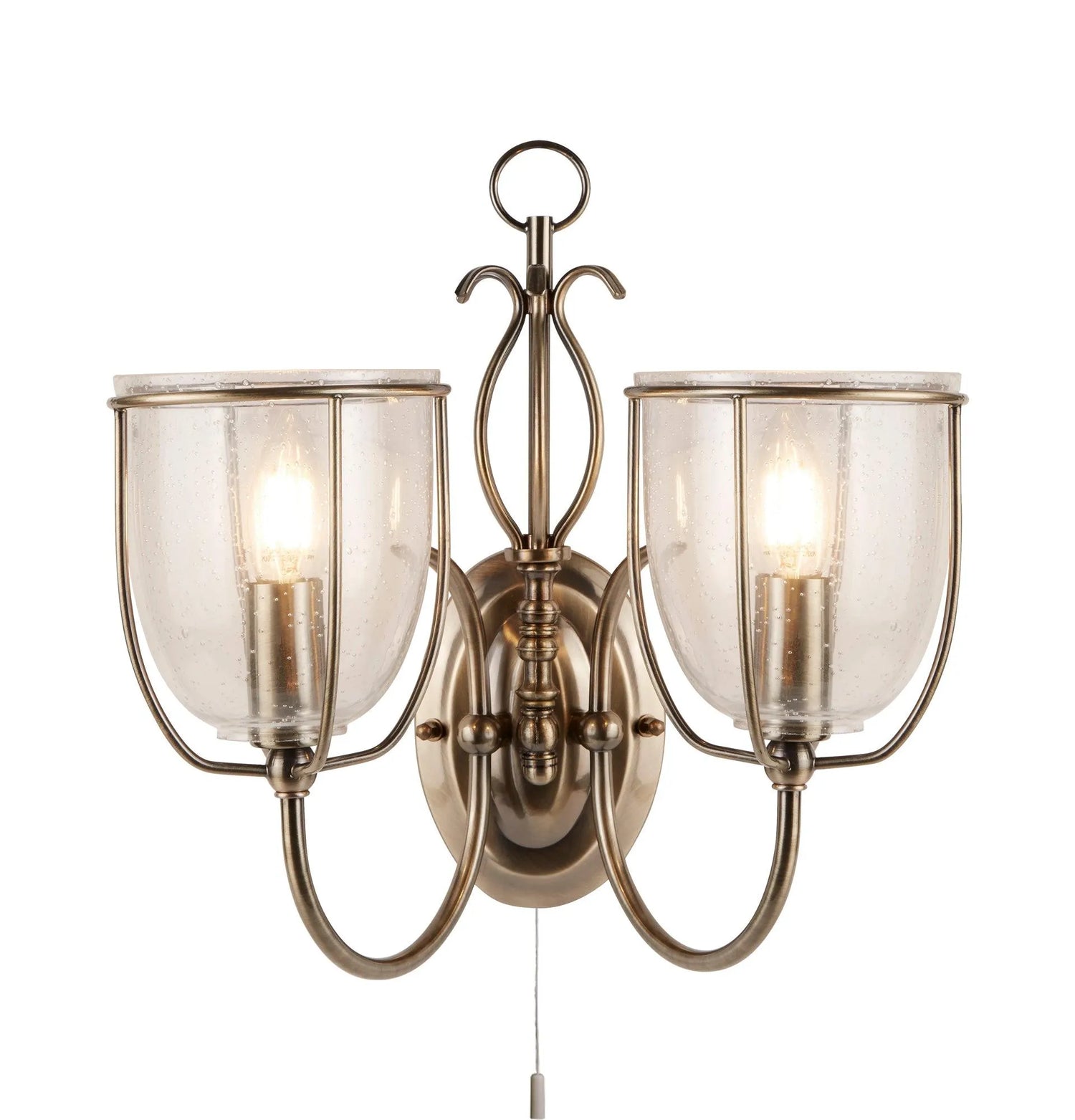 This Silhouette antique brass 2 light wall bracket with clear seeded glass shades is beautifully old fashioned and ornate. It has curved stems finished in antique brass and two upwards facing clear and seeded glass lamps, which create a welcoming glow whilst illuminating your walls. And it has a handy pull cord switch for convenience.