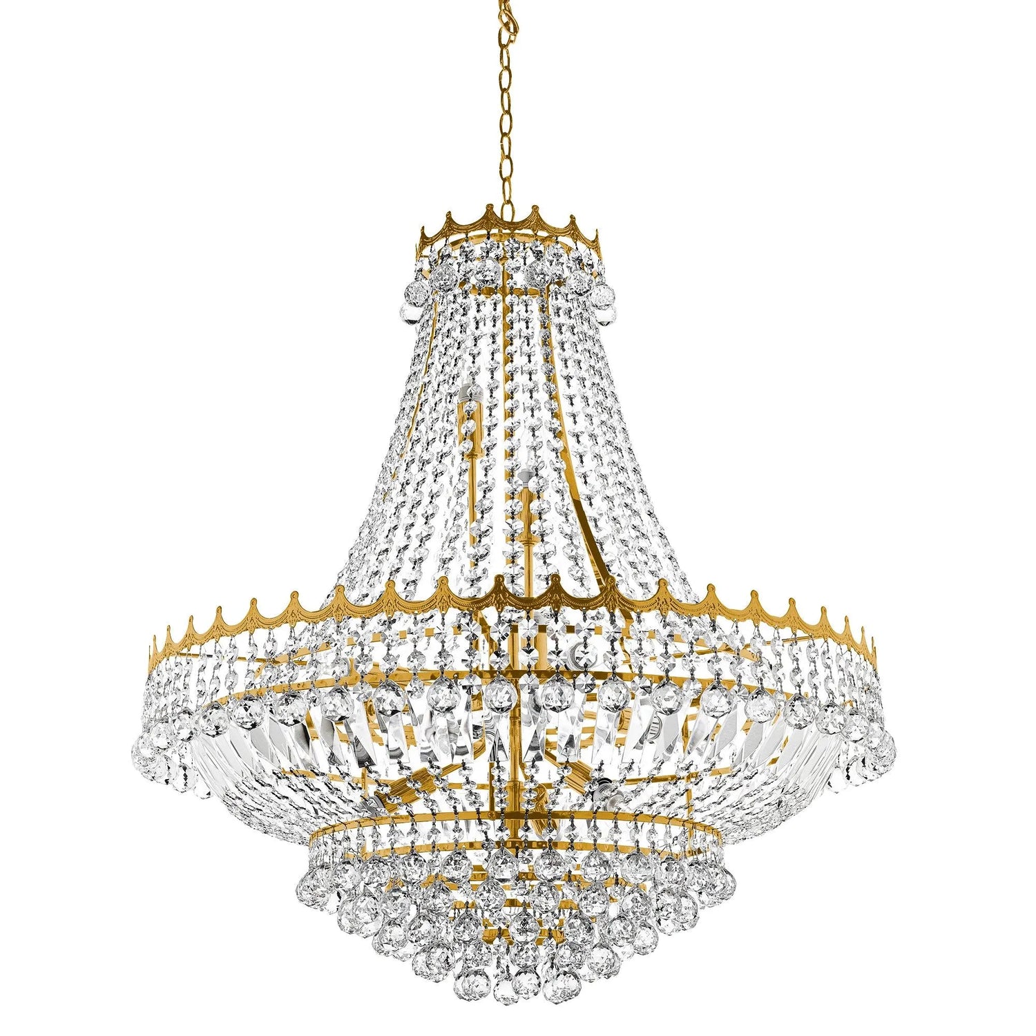 This large Versailles gold 13 light chandelier trimmed with crystal looks stunning in any main room or entrance. The vast traditional chandelier is brimming with intricate trimmed crystal which hangs in, around and below two beautiful crowns finished in gold. It looks amazing when the thirteen lights are lit up at night and makes a bold statement in any home.